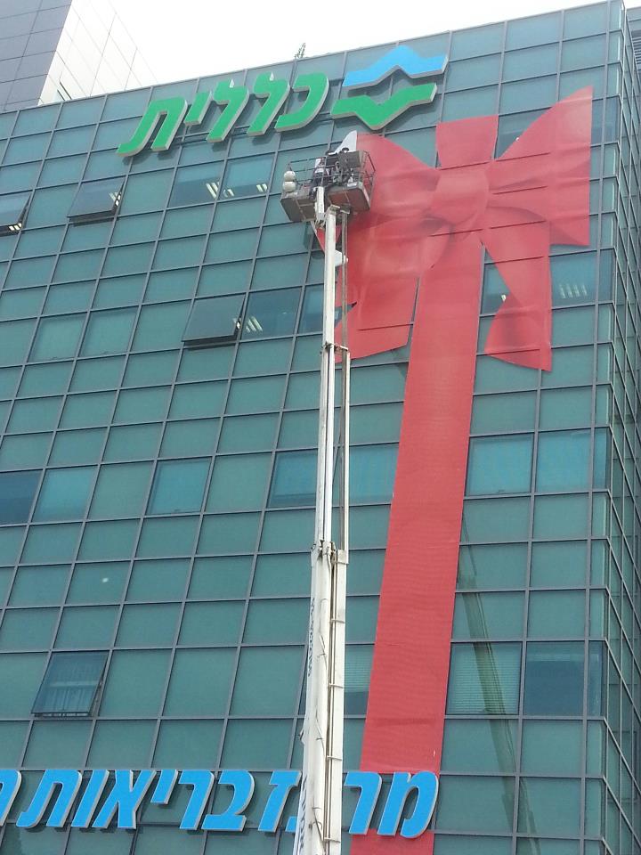 במסגרת פרויקט לקידום בניין של מרפאת שירותי בריאות כללית עלה רעיון מהסוג של המטורפים לעטוף את הבניין כאריזת מתנה לתושבים לטובת ההשקה. יחד עם צוותי מנוף לעבודה בגובה ובשילוב עבודת סנפלינג מאתגרת הצלחנו לעטוף את הבניין ולייצר את האווירה הרצויה. במקביל הופק אירוע השקה עם פעילויות לקהל עם תכנים למגע עם צוותי שירותי בריאות כללית והיכרות עם המחלקות והציוד בבניין.